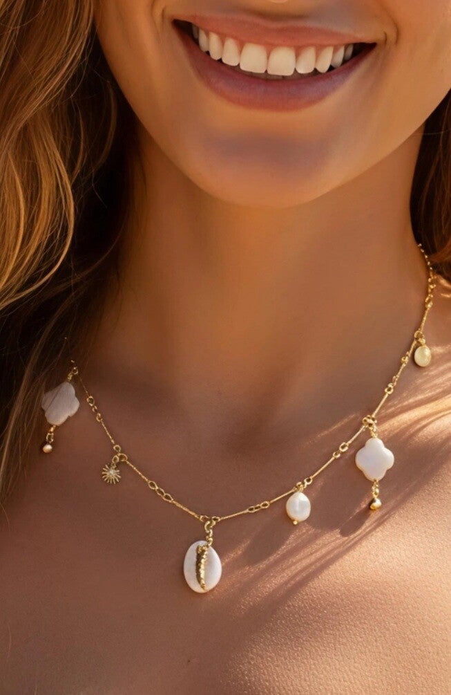 Craquez pour ce superbe collier aux détails coquillages et trèfles en blanc nacré 🤍