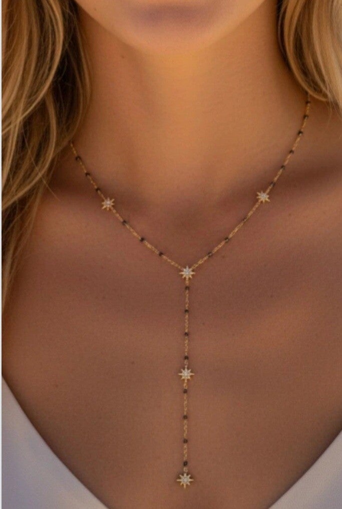 Succombez à ce superbe collier en Y doré, délicatement orné de petites étoiles polaires et de perles colorées… une véritable invitation à la lumière et à la bonne humeur 🌈