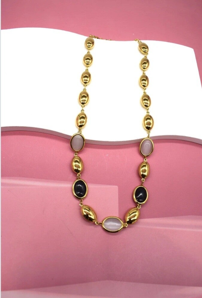 Faites briller votre look avec ce collier XXL en acier inoxydable, paré de pierres facettées aux deux couleurs pour un effet lumineux et sophistiqué 💎💛