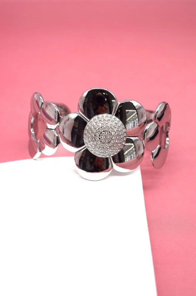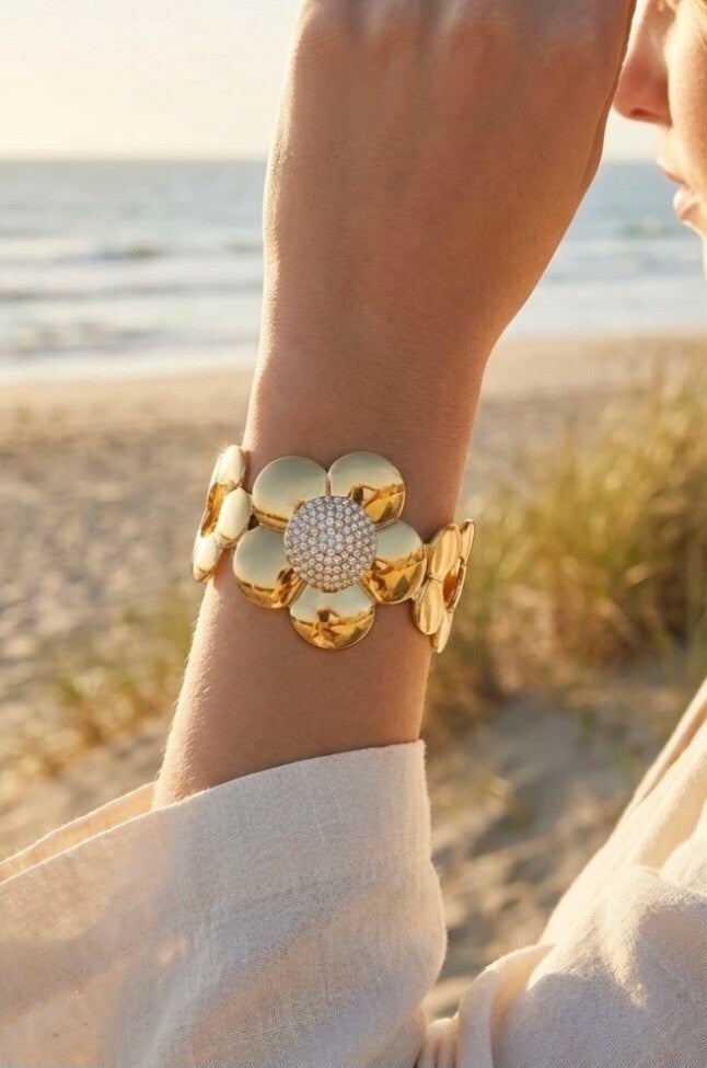 "Craquez pour ce bracelet manchette large en forme de marguerite, délicatement agrémenté de petits strass scintillants. En acier inoxydable et entièrement ajustable, il est disponible en doré ou en argenté dans la collection Été Vibes."