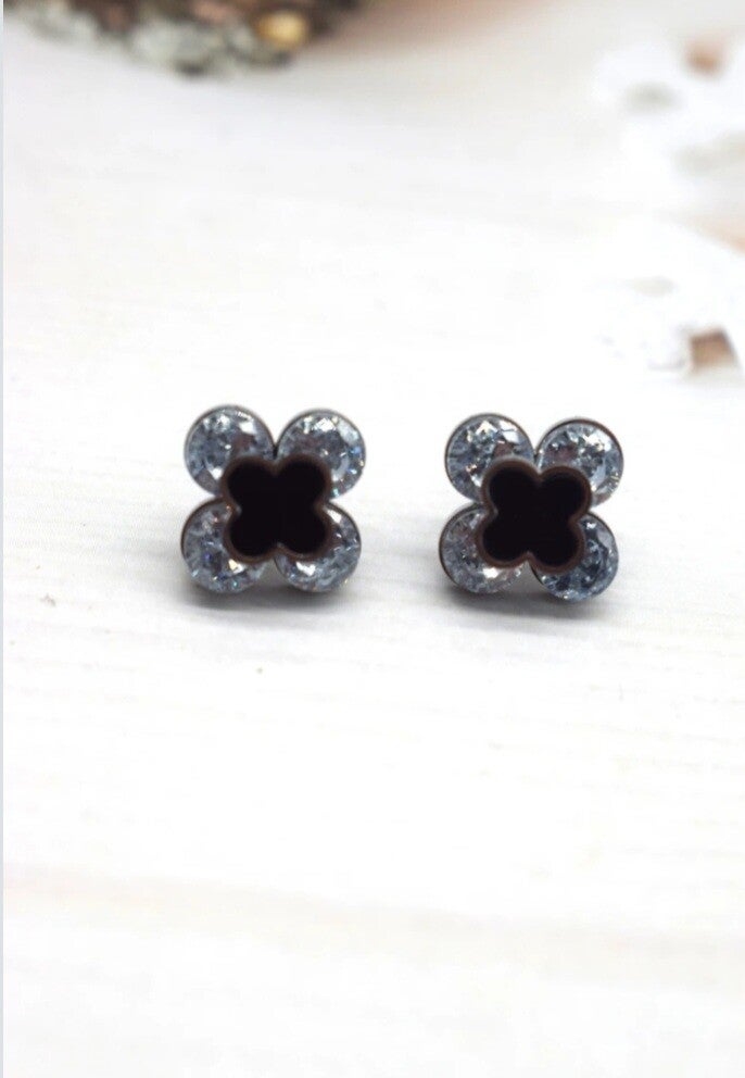 Craquez pour ces magnifiques petites boucles d’oreilles en forme de fleur trèfle 🍀, sublimées par un cœur noir profond et entourées de petits strass scintillants ✨ Un contraste chic et lumineux qui apporte une touche d’élégance à toutes vos tenues 🖤
